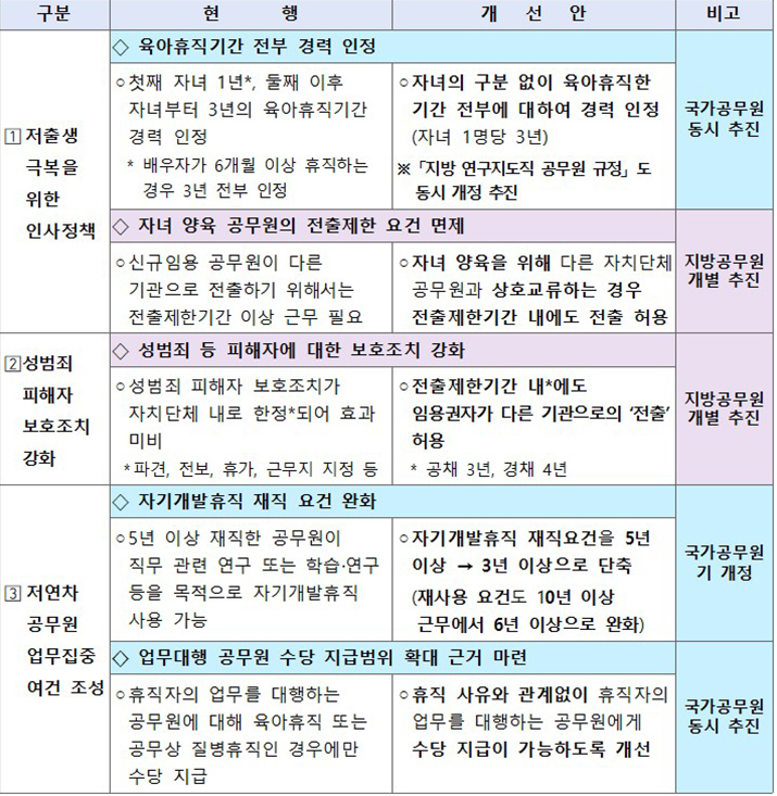 지방공무원 지원 강화 2025년 1월 초부터 시행 예정인 ‘지방공무원 임용령’ 등 인사관계 법령 개정안에 따라 첫째 자녀에 대해 육아휴직 시 최대 1년인 경력인정기간을 휴직기간 전부(자녀 1명당 휴직 최대 3년)로 확대한다.