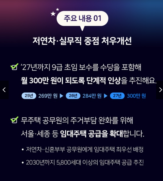 저연차, 실무직 중점 처우개선 내용으로 무주택 공무원의 주거부담 완화를 위해 서울·세종 등 임대주택 공급을 확대합니다. 저연차· 신혼부부 공무원에게 임대주택 최우선 배정하고, 2030년까지 5,800세대 이상의 임대주택 공급을 추진합니다.