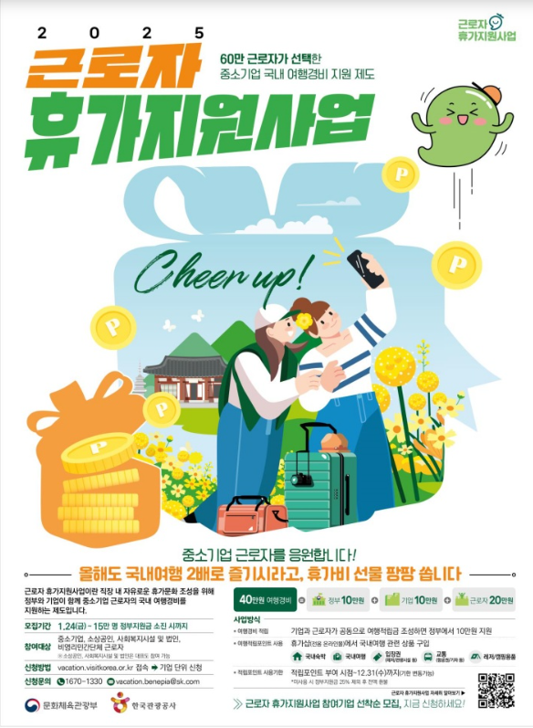 ' 2025년 근로자 휴가지원 사업'에 참여할 기업을 모집합니다. 총40만원의 국내 여행 경비 지원을 한다고 하는데요, 어떻게 하면 40만원의 경비 지원을 받을 수 있는지 해당 사업내용 함께 알아보도록 해요!