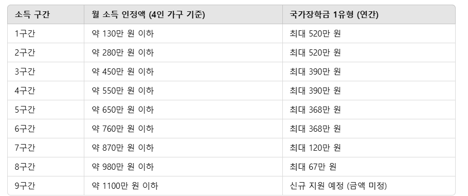 ※ 위 금액은 매년 변경될 수 있으며, 구체적인 지원 금액 및 기준은 한국장학재단 홈페이지에서 확인해야 합니다.