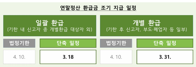 국세청은 연말정산 환급금을 조기에 지급하기 위해 일정 요건을 충족하는 기업 및 근로자에게 3월 18일까지 조기 환급을 실시합니다. 신청 기한 및 조기 지급 일정은 다음과 같습니다.